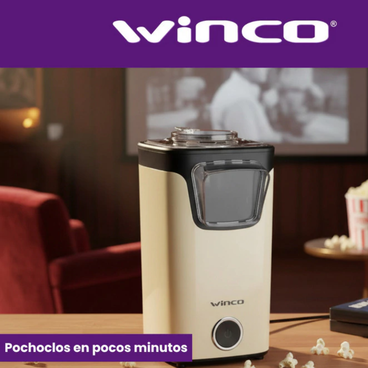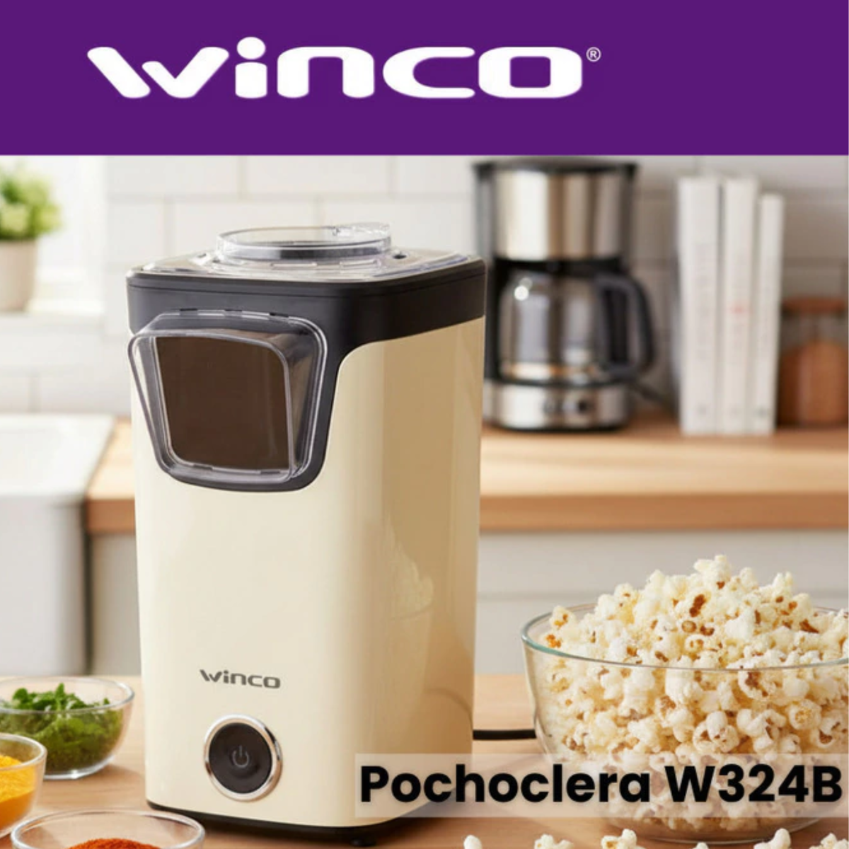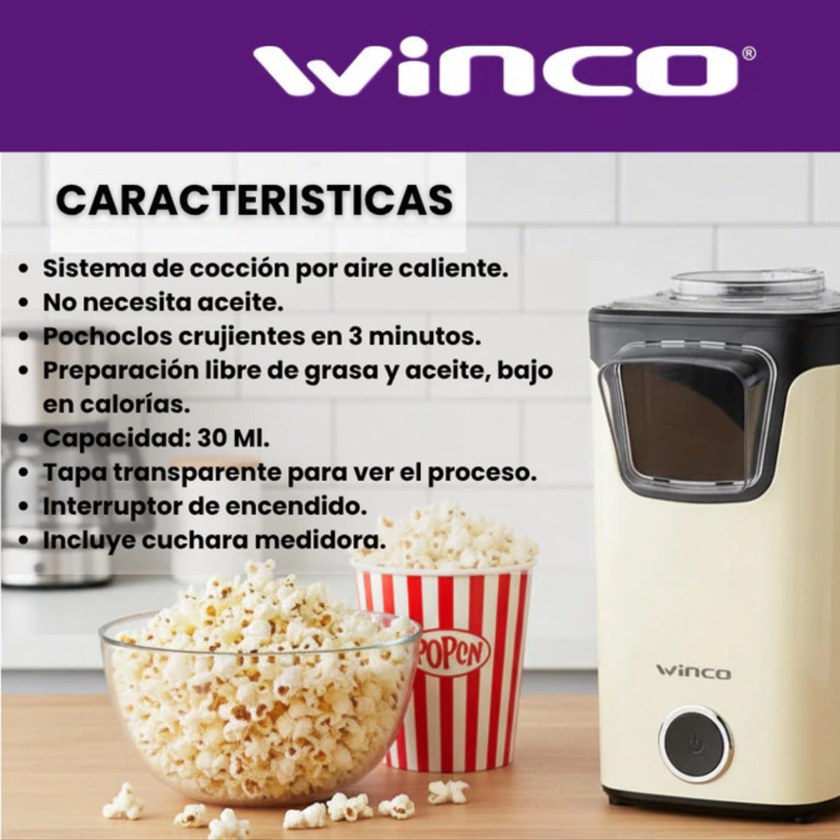 La pochoclera eléctrica Winco W324B es un electrodoméstico diseñado para preparar pochoclo de forma rápida, saludable y sin complicaciones, ideal tanto para uso doméstico como para espacios de entretenimiento familiar. Su diseño blanco y compacto combina funcionalidad con estética moderna, integrándose fácilmente en cocinas, salas de juegos o zonas de entretenimiento.