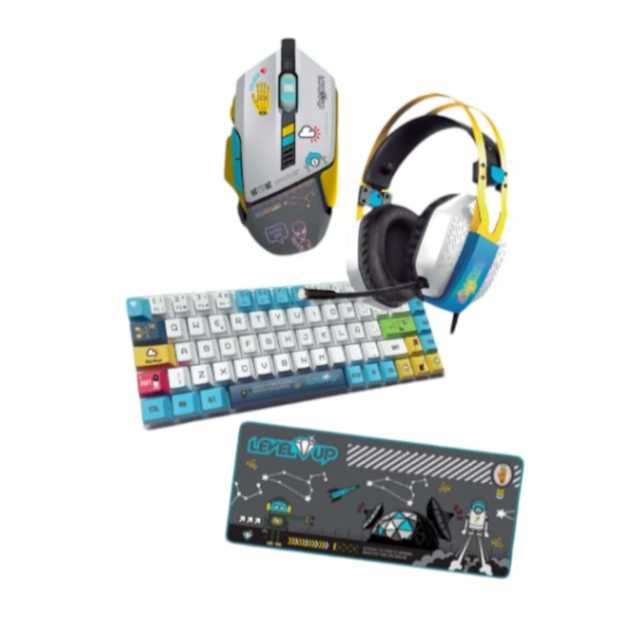 Completo: incluye teclado, mouse, auriculares y mousepad, todo coordinado.